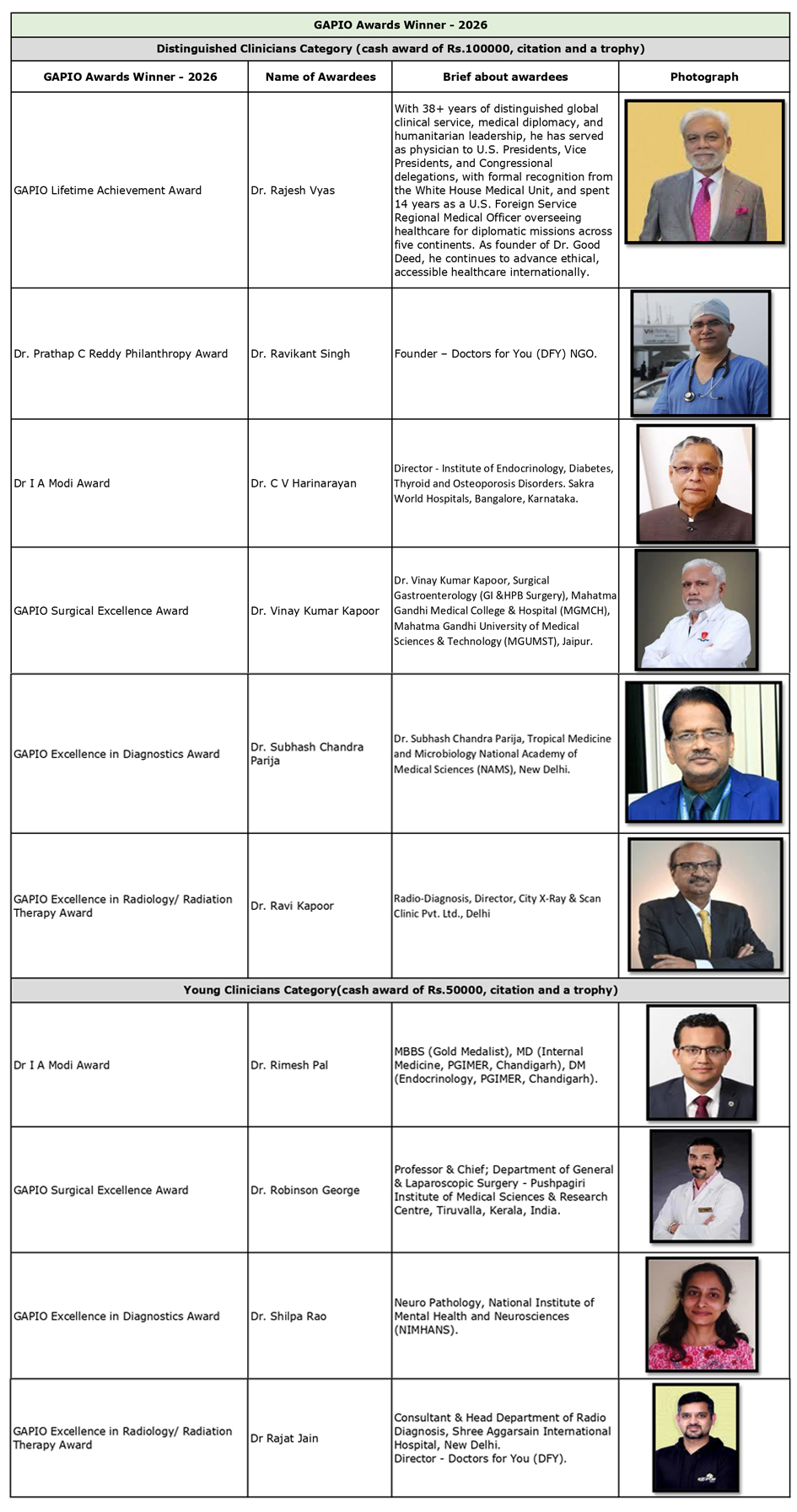 In order to recognize the Excellence in various Healthcare services by Indian Doctors and to honor them, GAPIO is pleased to announce the following awards which will be given this year during the 16th Annual Conference scheduled on 14-15 February 2026 at Indore under the following categories: